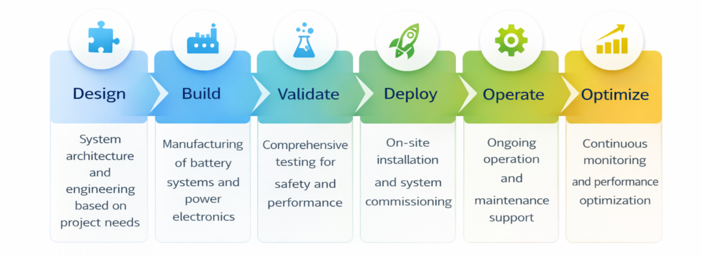 Our R&D focuses on battery system design, energy management systems (EMS) and smart BMS design, turning field feedback into continuous improvement.